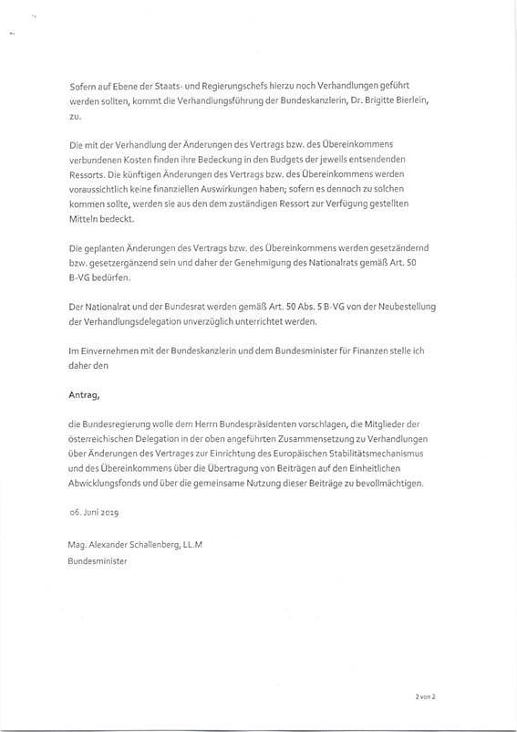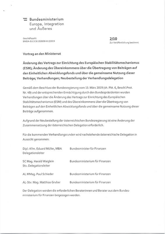 Bevollmächtigung der neubestellten Mitglieder der österreichischen Delegation zur Aufnahme von Verhandlungen über Änderungen des Vertrages zur Einrichtung des Europäischen Stabilitätsmechanismus (EMS) und des Übereinkommens über die Übertragung von Beiträgen auf den Einheitlichen Abwicklungsfonds und über die gemeinsame Nutzung dieser Beiträge (Anlage 5)