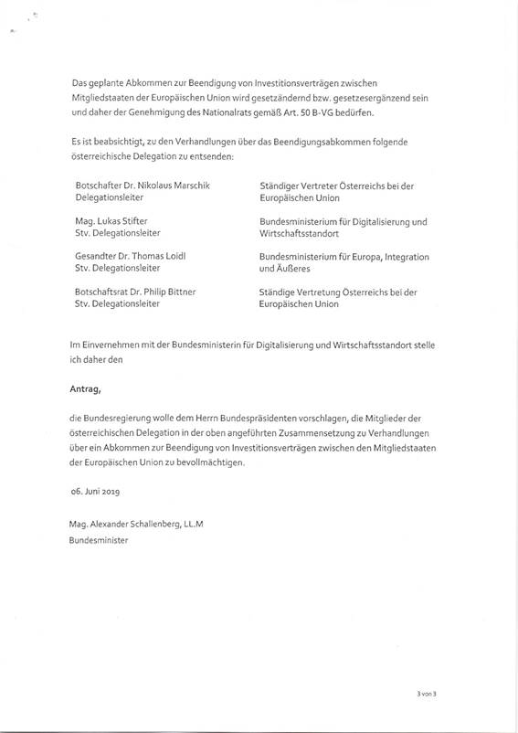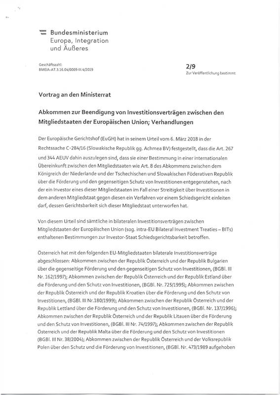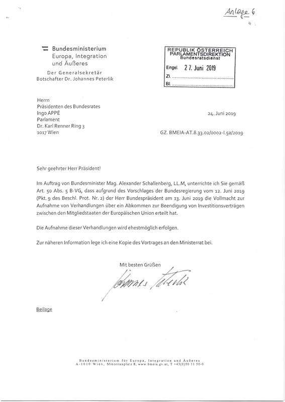 Aufnahme von Verhandlungen über ein Abkommen zur Beendigung von Investitionsverträgen zwischen den Mitgliedstaaten der Europäischen Union (Anlage 6)
