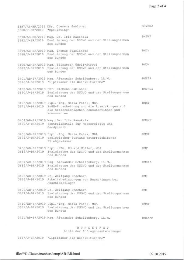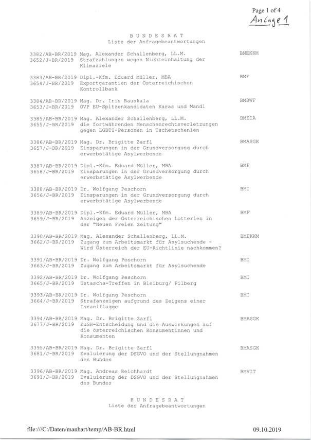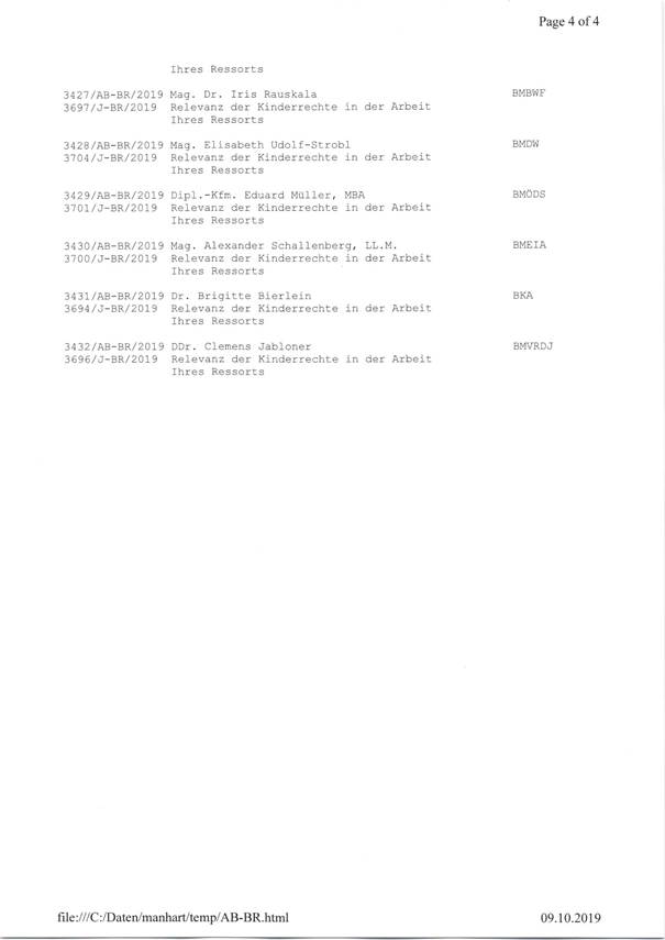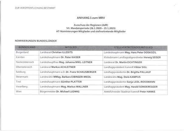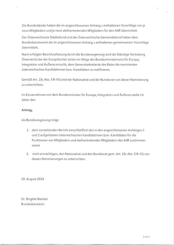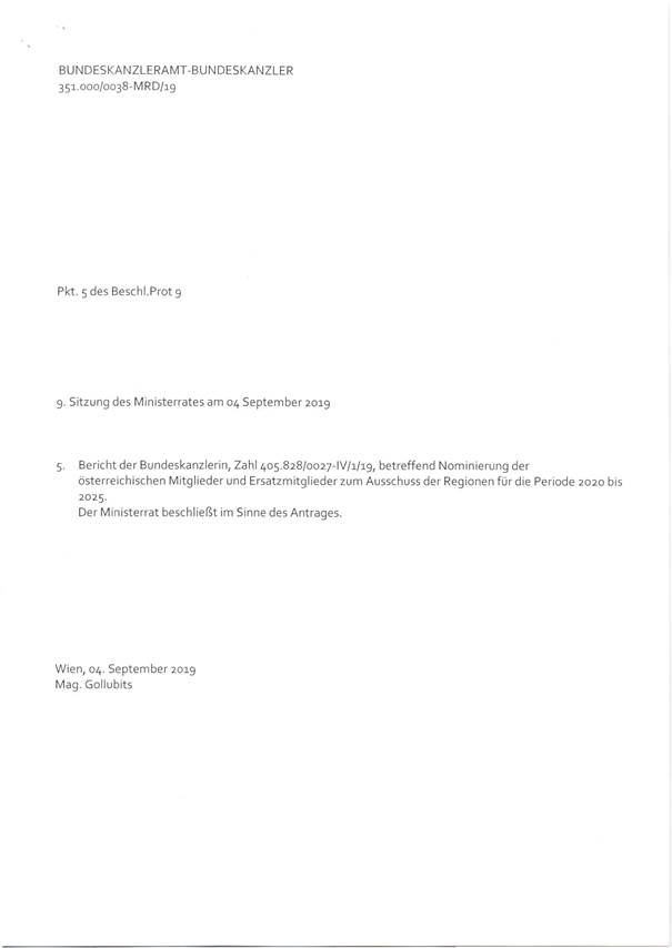 Schreiben der Bundeskanzlerin Dr. Brigitte Bierlein gemäß Art. 23c Abs. 5 B-VG betreffend Nominierung von Mitgliedern und Ersatzmitgliedern in den Ausschuss der Regionen für die Periode 2020 bis 2025 ............................................................................................................................... 43