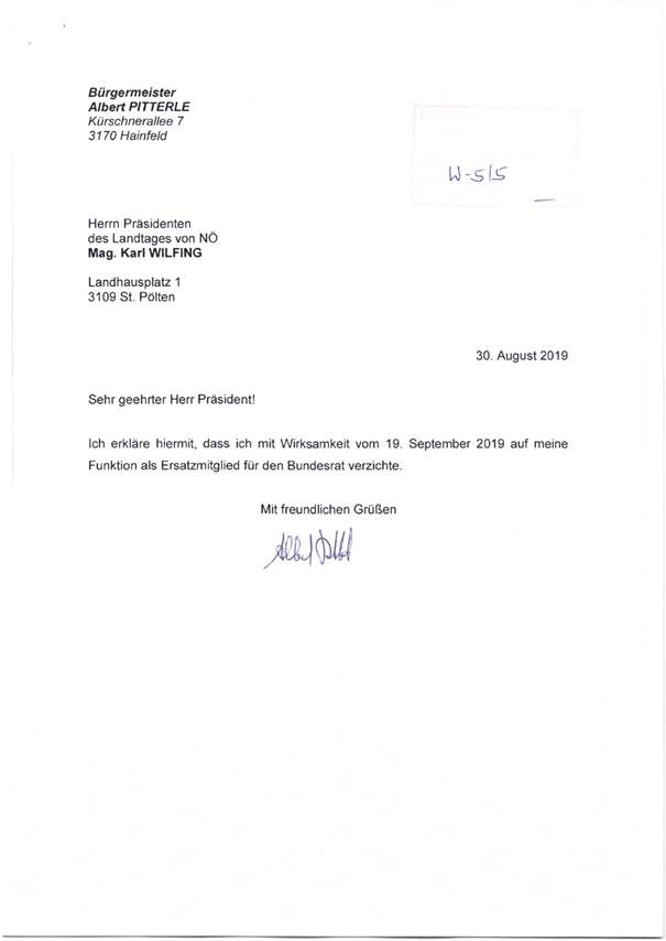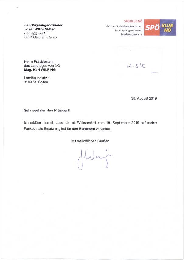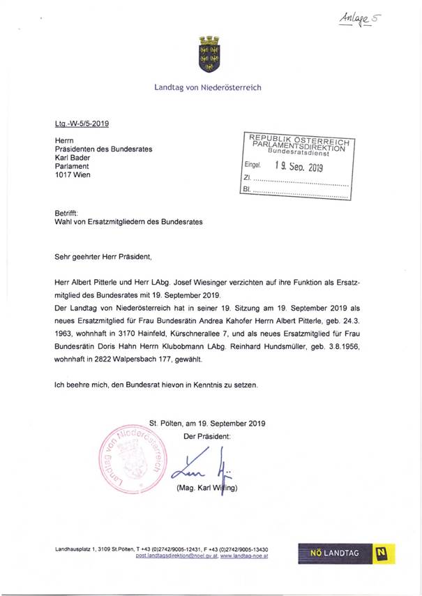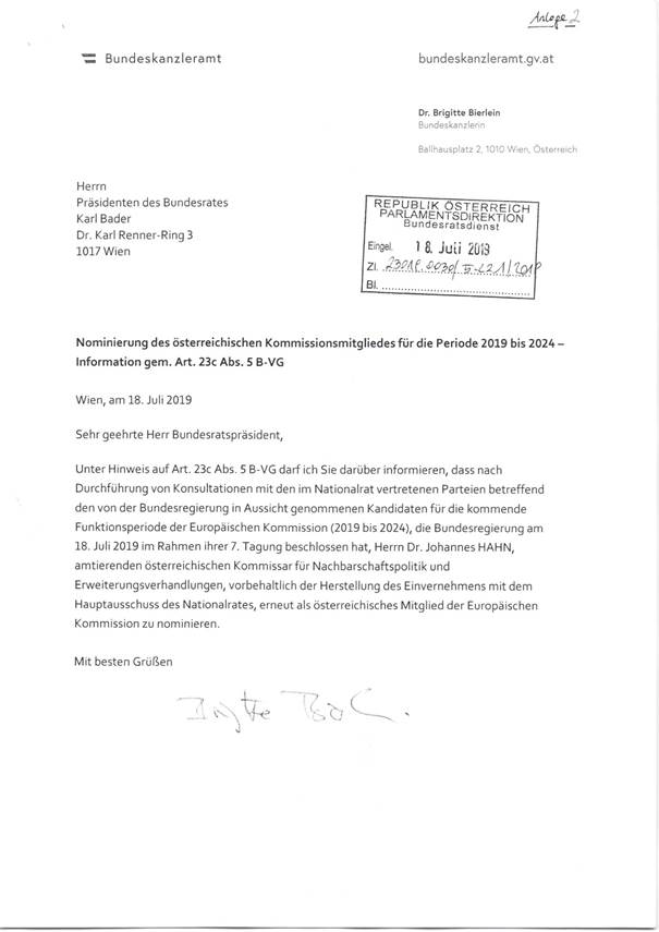 Schreiben der Bundeskanzlerin Dr. Brigitte Bierlein gemäß Art. 23c Abs. 5 B-VG betreffend Nominierung von Dr. Johannes Hahn zum Mitglied der Europäischen Kommission für die Periode 1. November 2019 bis 31. Oktober 2024 ............................................................................................................ 40