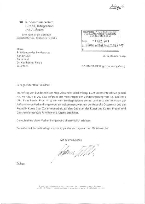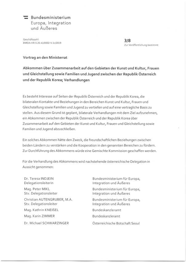Schreiben des Generalsekretärs des Bundesministeriums für Europa, Integration und Äußeres gemäß Art. 50 Abs. 5 B-VG betreffend Erteilung der Vollmacht zur Aufnahme von Verhandlungen über ein Abkommen zwischen der Republik Österreich und der Republik Korea über Zusammenarbeit auf den Gebieten der Kunst und Kultur, Frauen und Gleichstellung sowie Familien und Jugend durch den Bundespräsidenten ............................................................................................................................... 55