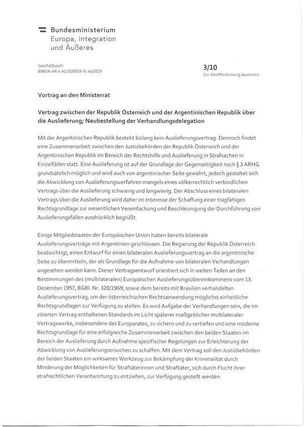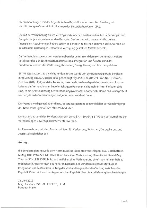 Schreiben des Generalsekretärs des Bundesministeriums für Europa, Integration und Äußeres gemäß Art. 50 Abs. 5 B-VG betreffend Erteilung der Vollmacht zur Aufnahme von Verhandlungen über den Vertrag zwischen der Republik Österreich und der Argentinischen Republik über die Auslieferung durch den Bundespräsidenten ..................................................................................................................... 58