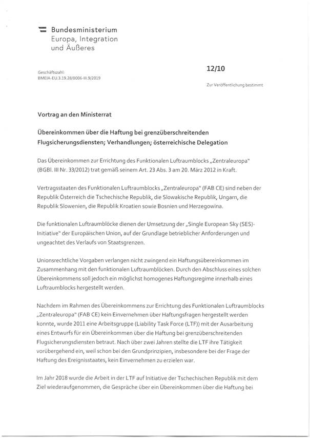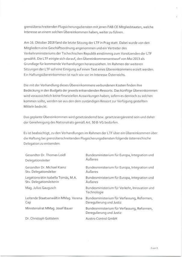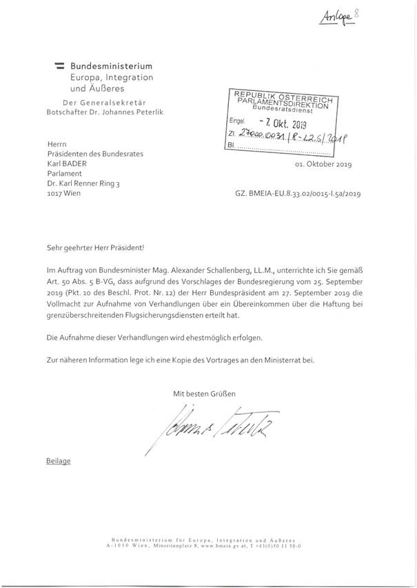 Schreiben des Generalsekretärs des Bundesministeriums für Europa, Integration und Äußeres gemäß Art. 50 Abs. 5 B-VG betreffend Erteilung der Vollmacht zur Aufnahme von Verhandlungen über ein Übereinkommen über die Haftung bei grenzüberschreitenden Flugsicherungsdiensten durch den Bundespräsidenten ........................................................................................................ 61