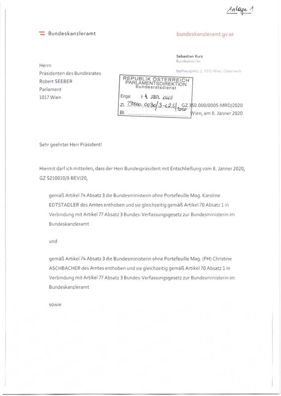 Schreiben des Bundeskanzlers Sebastian Kurz betreffend Amtsenthebung der Bundesministerinnen ohne Portefeuille Mag. Karoline Edtstadler, Mag. (FH) Christine Aschbacher und MMag. Dr. Susanne Raab bei gleichzeitiger Ernennung zu Bundesministerinnen im Bundeskanzleramt durch den Bundespräsidenten ............................................................................................................................... 36