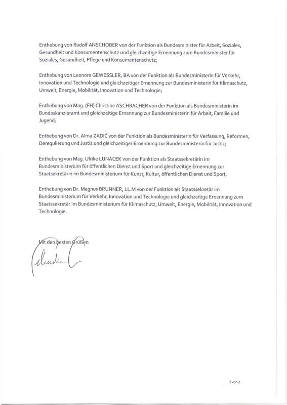 Schreiben des Bundeskanzlers Sebastian Kurz betreffend Amtsenthebung beziehungsweise Ernennung von Mitgliedern der Bundesregierung aufgrund der Änderungen im Bundesministeriengesetz BGBl. I Nr. 8/2020 durch den Bundespräsidenten ..................................................................... 38