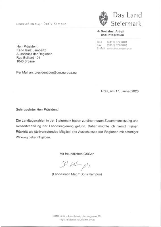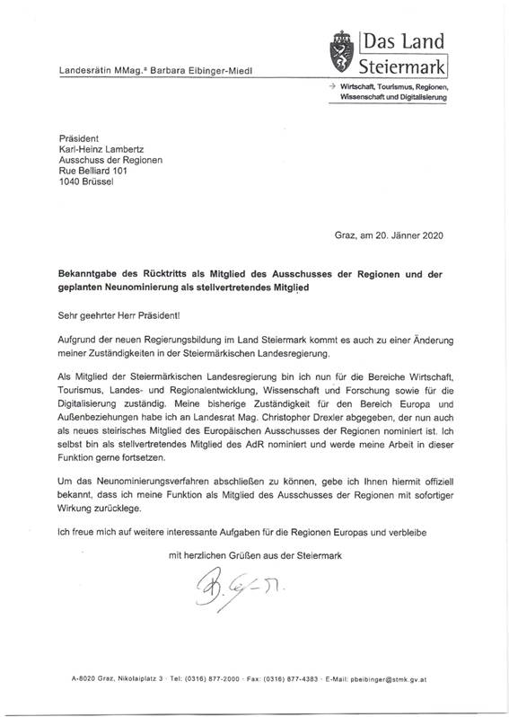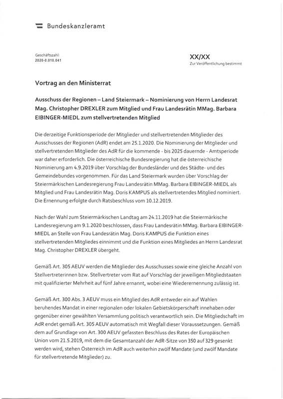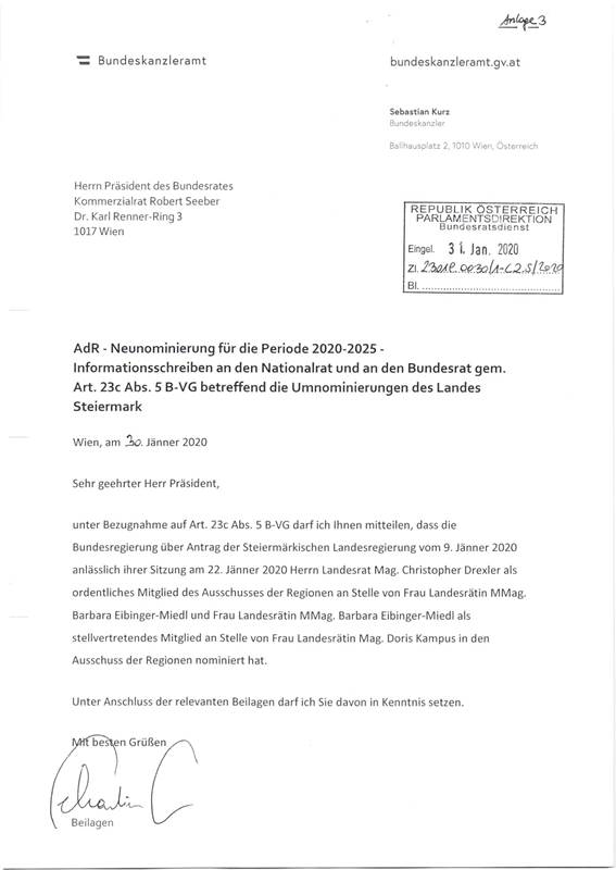 Schreiben des Bundeskanzlers Sebastian Kurz gemäß Art. 23c Abs. 5 B-VG betreffend Nominierung eines Mitglieds und eines stellvertretenden Mitglieds in den Ausschuss der Regionen .......... 40