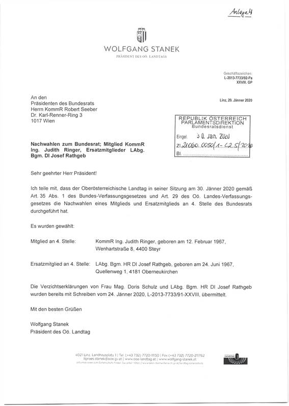 Schreiben des Präsidenten des Oberösterreichischen Landtages betreffend Mandatsverzicht der Bundesrätin Mag. Doris Schulz und eines Ersatzmitglieds des Bundesrates sowie Wahl eines Mitglieds und eines Ersatzmitglieds des Bundesrates ........................................................................ 46