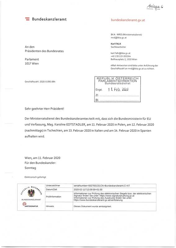Schreiben des Bundeskanzleramtes betreffend Aufenthalt von Mitgliedern der Bundesregierung in einem anderen Mitgliedstaat der Europäischen Union .............................................................. 50