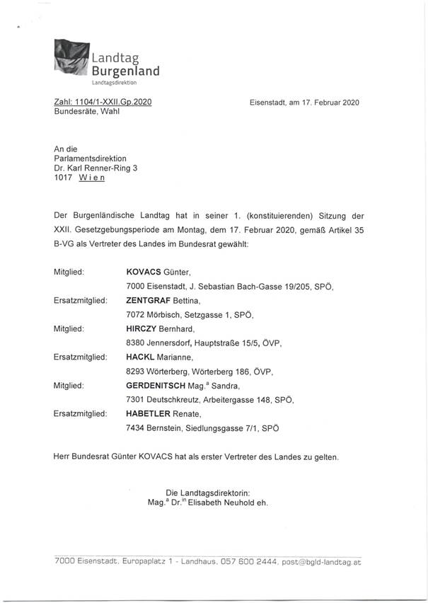 Schreiben des Burgenländischen Landtages betreffend Wahl von Mitgliedern und Ersatzmitgliedern (Anlage 2)