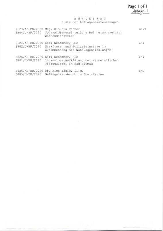Ich gebe bekannt, dass seit der letzten beziehungsweise in der heutigen Sitzung insgesamt eine Anfrage, nämlich 3817/J-BR/2020, eingebracht wurde.