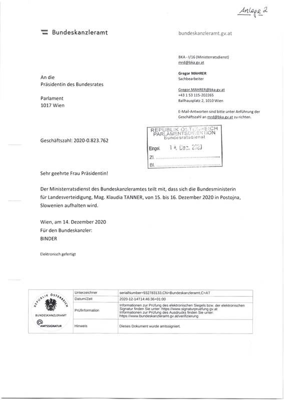 Die Einberufung der nächsten Sitzung des Bundesrates ist bereits auf schriftlichem Wege erfolgt. Als Sitzungstermin ist morgen, Donnerstag, der 17. Dezember 2020, 9 Uhr in Aussicht genommen.