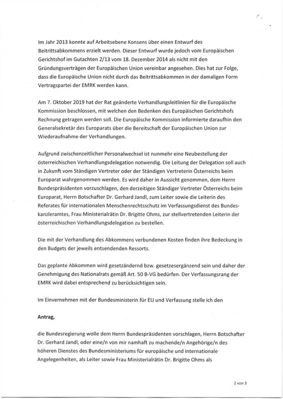 Schreiben des Generalsekretärs des Bundesministeriums für europäische und internationale Angelegenheiten gemäß Art. 50 Abs. 5 B-VG betreffend Erteilung der Vollmacht zur Aufnahme von Verhandlungen über ein Abkommen über den Beitritt der Europäischen Union zur Europäischen Konvention zum Schutze der Menschenrechte und Grundfreiheiten durch den Bundespräsidenten ............................................................................................................................... 15