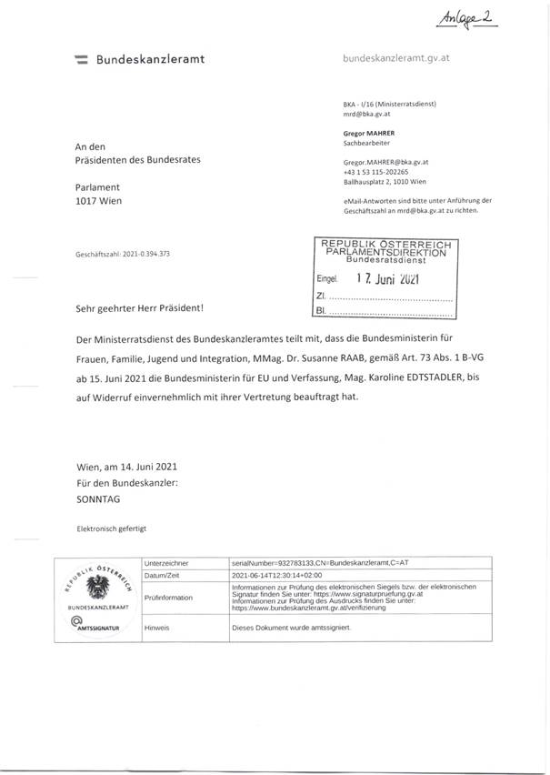 Schreiben des Ministerratsdienstes des Bundeskanzleramtes betreffend Vertretung von Frau Bundesministerin für Frauen, Familie, Jugend und Integration MMag. Dr. Susanne Raab ab 15. Juni 2021 durch Frau Bundesministerin für EU und Verfassung Mag. Karoline Edtstadler gemäß Art. 73 Abs. 1 B-VG bis auf Widerruf (Anlage 2)