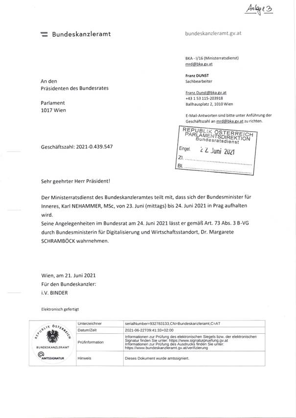 Schreiben des Ministerratsdienstes des Bundeskanzleramtes betreffend den Aufenthalt von Herrn Bundesminister für Inneres Karl Nehammer, MSc am 23. Juni (vormittags) und 24. Juni 2021 in Prag, wobei seine Angelegenheiten im Bundesrat gemäß Art. 73 Abs. 3 B-VG Frau Bundesministerin für Digitalisierung und Wirtschaftsstandort Dr. Margarete Schramböck wahrnehmen wird (Anlage 3)