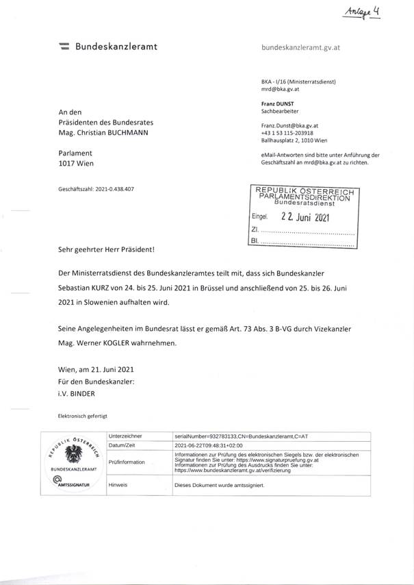 Schreiben des Ministerratsdienstes des Bundeskanzleramtes betreffend den Aufenthalt von Herrn Bundeskanzler Sebastian Kurz am 24. und 25. Juni 2021 in Brüssel, wobei seine Angelegenheiten im Bundesrat gemäß Art. 73 Abs. 3 B-VG Herr Vizekanzler Mag. Werner Kogler wahrnehmen wird (Anlage 4)