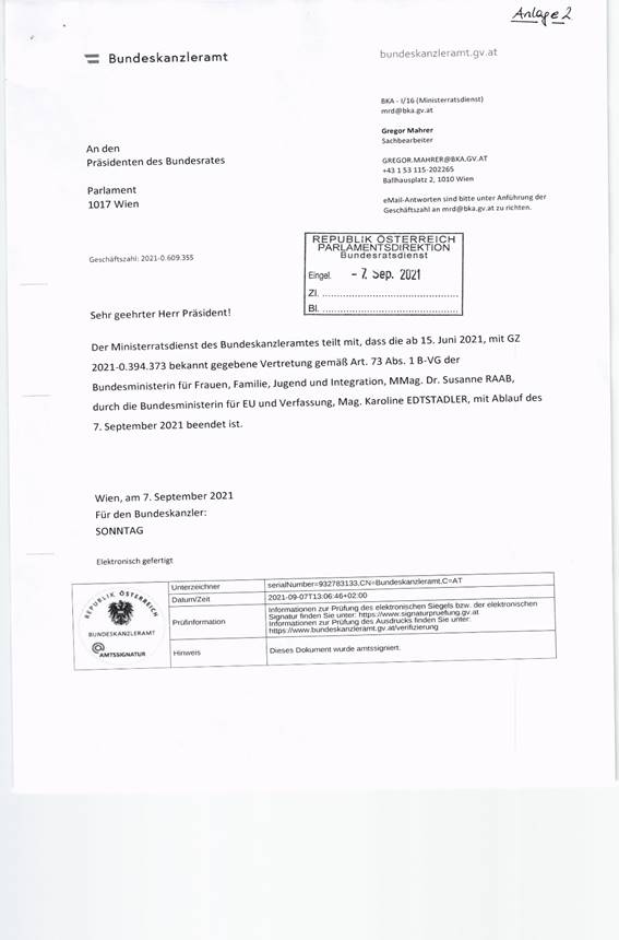 betreffend die Beendigung der Vertretung von Frau Bundesministerin für Frauen, Familie, Jugend und Integration MMag. Dr. Susanne Raab durch Frau Bundesministerin für EU und Verfassung Mag. Karoline Edtstadler gemäß Art. 73 Abs. 1 B-VG mit Ablauf 7. September 2021 (Anlage 2)