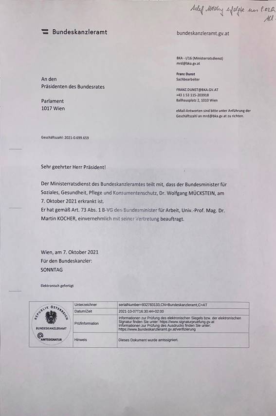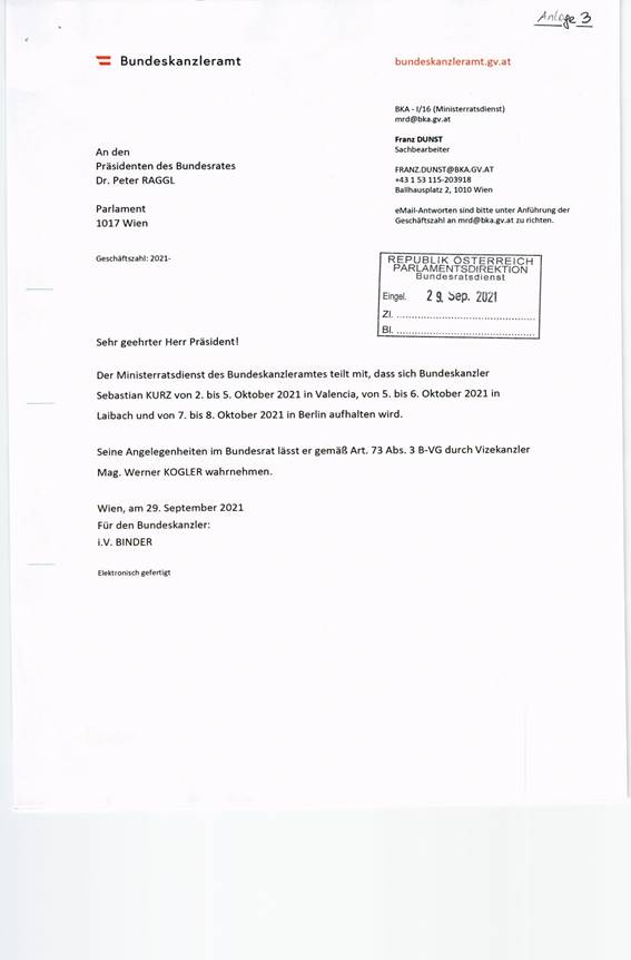 betreffend den Aufenthalt von Herrn Bundeskanzler Sebastian Kurz am 7. und 8. Oktober 2021 in Berlin, wobei seine Angelegenheiten im Bundesrat gemäß Art. 73 Abs. 3 B-VG der Vizekanzler Mag. Werner Kogler wahrnehmen wird (Anlage 3)