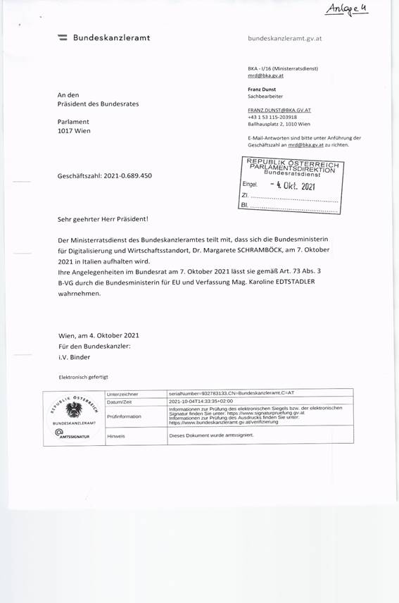 betreffend den Aufenthalt von Frau Bundesministerin für Digitalisierung und Wirtschaftsstandort Dr. Margarete Schramböck am 7. Oktober 2021 in Italien, wobei ihre Angelegenheiten im Bundesrat gemäß Art. 73 Abs. 3 B-VG die Bundesministerin für EU und Verfassung Mag. Karoline Edtstadler wahrnehmen wird (Anlage 4)