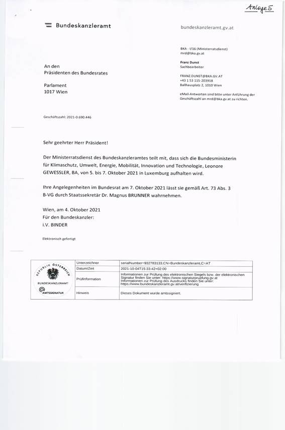 betreffend den Aufenthalt von Frau Bundesministerin für Klimaschutz, Umwelt, Energie, Mobilität, Innovation und Technologie Leonore Gewessler, BA vom 5. bis 7. Oktober 2021 in Luxemburg, wobei ihre Angelegenheiten im Bundesrat gemäß Art. 73 Abs. 3 B-VG der Staatssekretär im Bundesministerium für Klimaschutz, Umwelt, Energie, Mobilität, Innovation und Technologie Dr. Magnus Brunner, LL.M. wahrnehmen wird (Anlage 5)