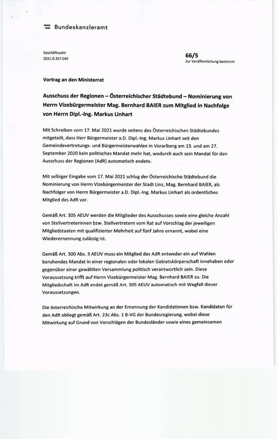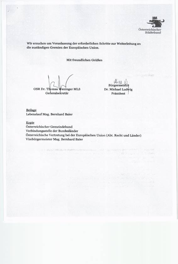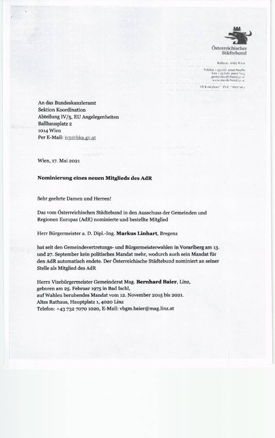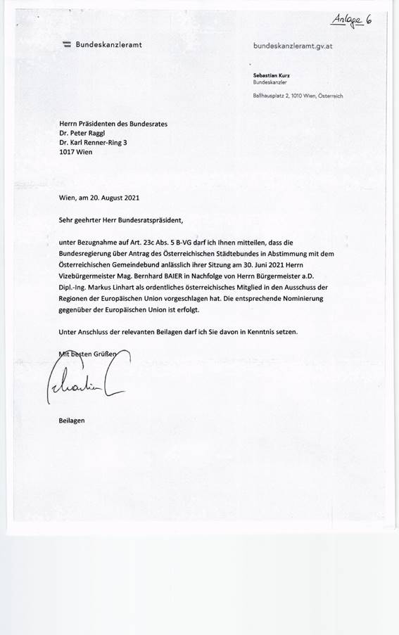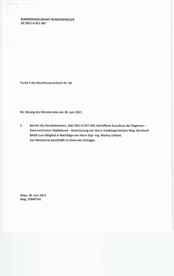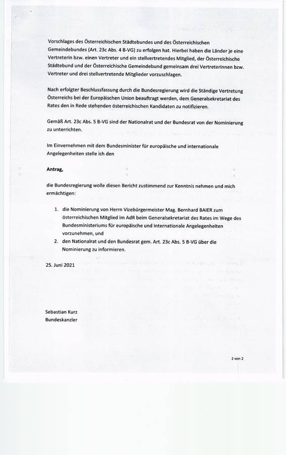 Nominierung von Herrn Vizebürgermeister Mag. Bernhard Baier als Mitglied in den Ausschuss der Regionen (Anlage 6)
