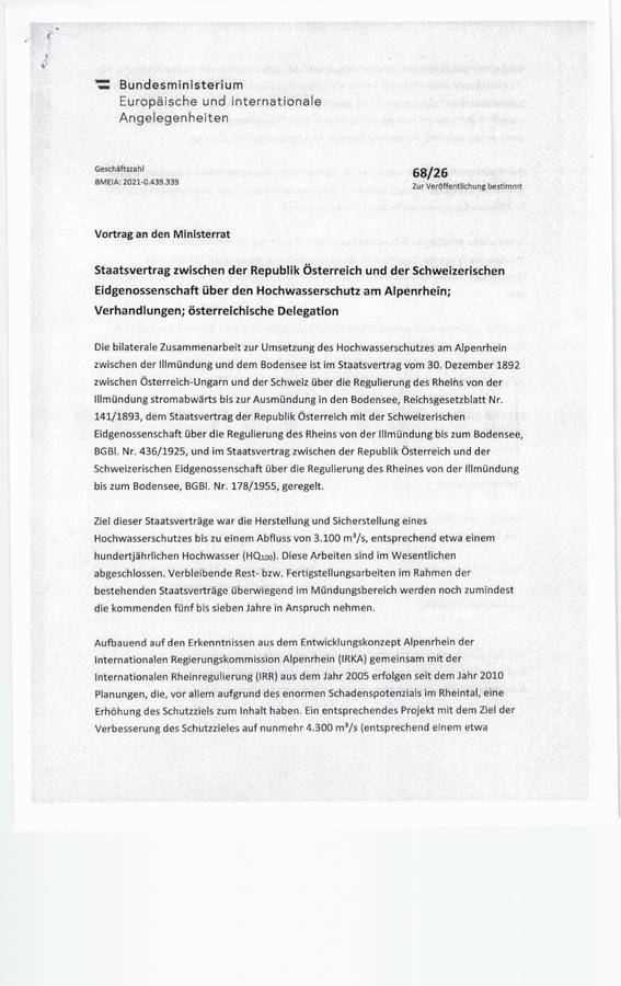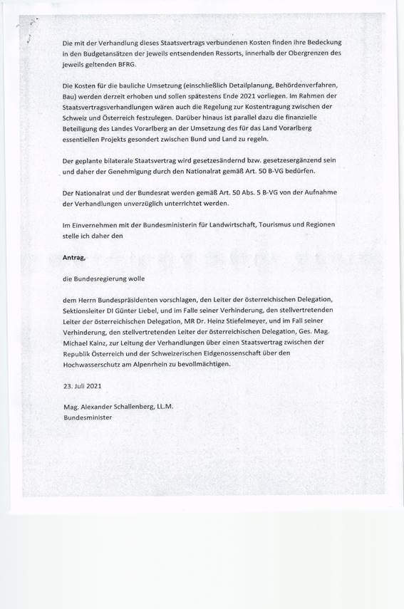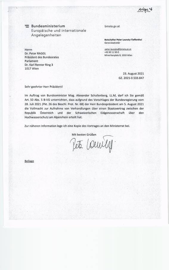 Schreiben des Generalsekretärs betreffend die Vollmacht zur Aufnahme von Verhandlungen über einen Staatsvertrag zwischen der Republik Österreich und der Schweizerischen Eidgenossenschaft über den Hochwasserschutz am Alpenrhein (Anlage 7)