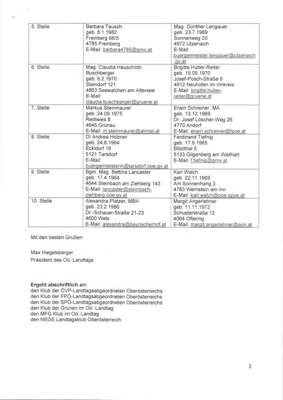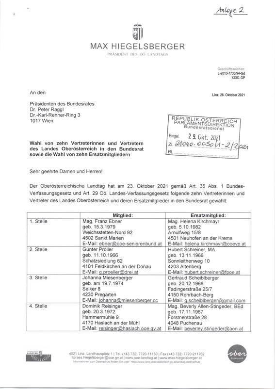Schreiben des Oberösterreichischen Landtages betreffend Wahl von Mitgliedern und Ersatzmitgliedern des Bundesrates (Anlage 2)