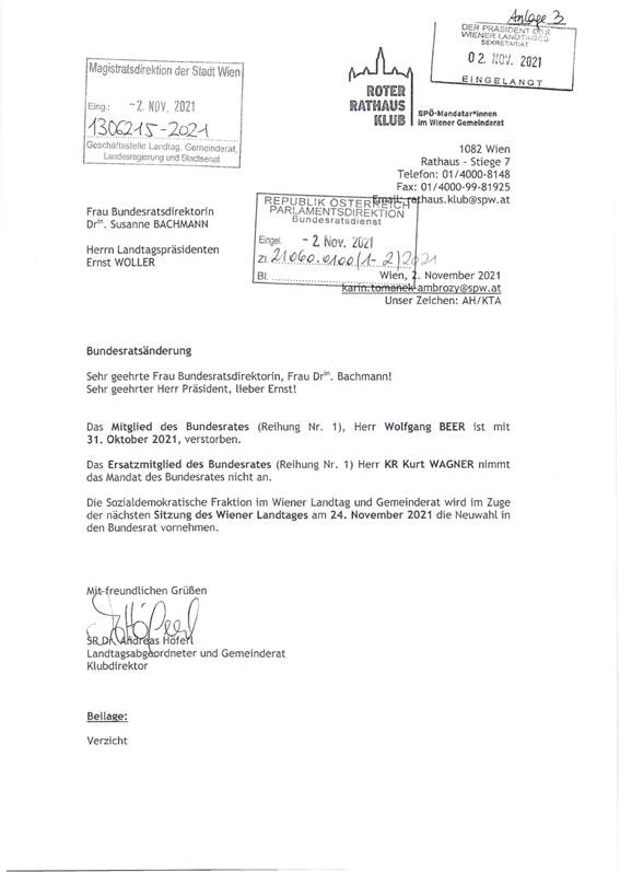Schreiben der Magistratsdirektion der Stadt Wien betreffend Mandatsverzicht eines Ersatzmitgliedes (Anlage 3)