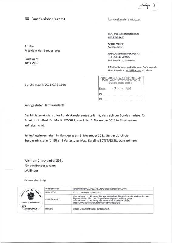 Schreiben des Ministerratsdienstes betreffend den Aufenthalt von Herrn Bundesminister für Arbeit Mag. Dr. Martin Kocher am 3. und 4. November 2021 in Griechenland, wobei seine Angelegenheiten im Bundesrat Frau Bundesministerin für EU und Verfassung Mag. Karoline Edtstadler wahrnehmen wird (Anlage 4)