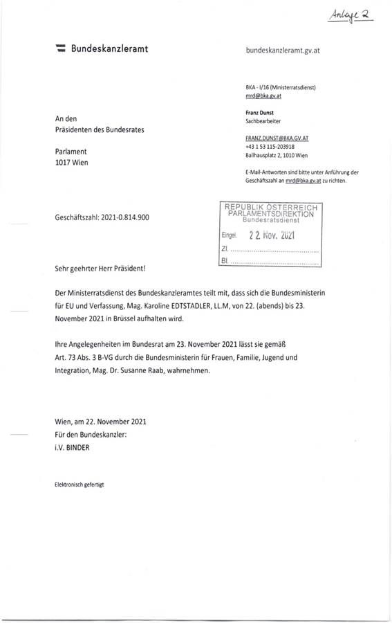 Schreiben des Ministerratsdienstes betreffend den Aufenthalt von Frau Bundesministerin für EU und Verfassung Mag. Karoline Edtstadler am 22. November (abends) und 23. November 2021 in Brüssel, wobei ihre Angelegenheiten im Bundesrat Frau Bundesministerin für Frauen, Familie, Jugend und Integration MMag. Dr. Susanne Raab wahrnehmen wird (Anlage 2)