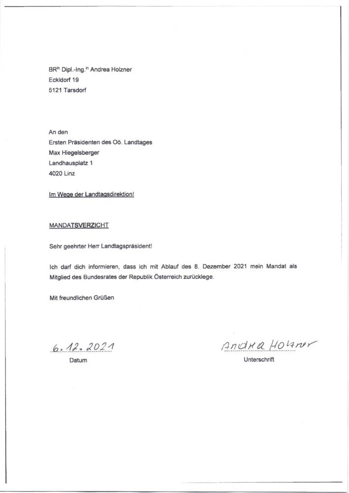 Schreiben des Oberösterreichischen Landtages betreffend Mandatsverzicht der Bundesrätin Dipl.-Ing. Andrea Holzner .................................................................. 22