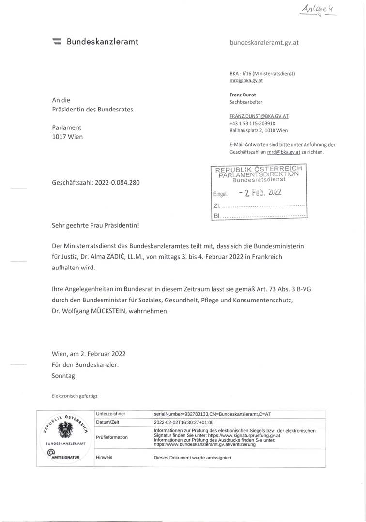 Schreiben des Bundeskanzleramtes betreffend Aufenthalt von Mitgliedern der Bundesregierung in einem anderen Mitgliedstaat der Europäischen Union 62, 63, 64
