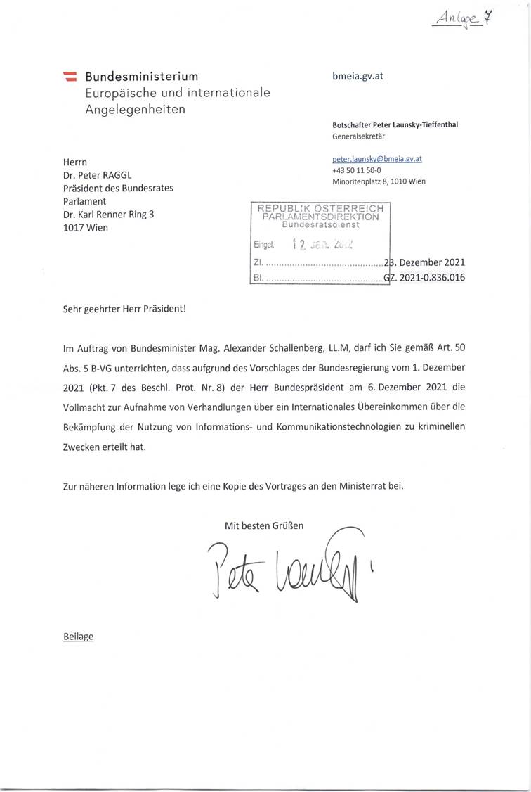 Schreiben des Generalsekretärs des Bundesministeriums für europäische und internationale Angelegenheiten gemäß Art. 50 Abs. 5 B-VG betreffend Erteilung der Vollmacht zur Aufnahme von Verhandlungen über ein Internationales Übereinkommen über die Bekämpfung der Nutzung von Informations- und Kommunikationstechnologien zu kriminellen Zwecken durch den Herrn Bundespräsidenten 74