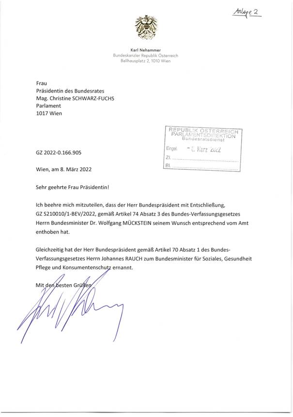 eines Schreibens des Bundeskanzleramtes betreffend Amtsenthebung des Herrn Bundesministers Dr. Wolfgang Mückstein gemäß Art. 74 Abs. 3 Bundes-Verfassungsgesetz bei gleichzeitiger Ernennung von Herrn Johannes Rauch zum Bundesminister für Soziales, Gesundheit, Pflege und Konsumentenschutz gemäß Art. 70 Abs. 1 Bundes-Verfassungsgesetz durch den Herrn Bundespräsidenten,