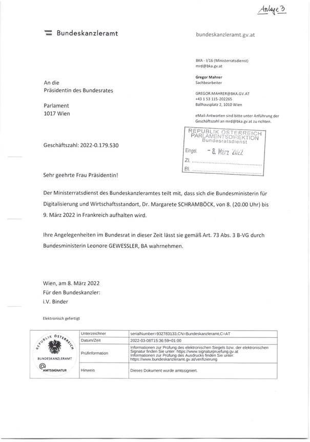 Schreiben des Ministerratsdienstes betreffend den Aufenthalt von Bundesministerin für Digitalisierung und Wirtschaftsstandort, Dr. Margarete Schramböck am 8. (20.00 Uhr) bis 9. März 2022 in Frankreich wobei ihre Angelegenheiten gemäß Art. 73 Abs. 3 Bundes-Verfassungsgesetz durch die Bundesministerin Leonore Gewessler, BA wahrgenommen werden (Anlage 3)