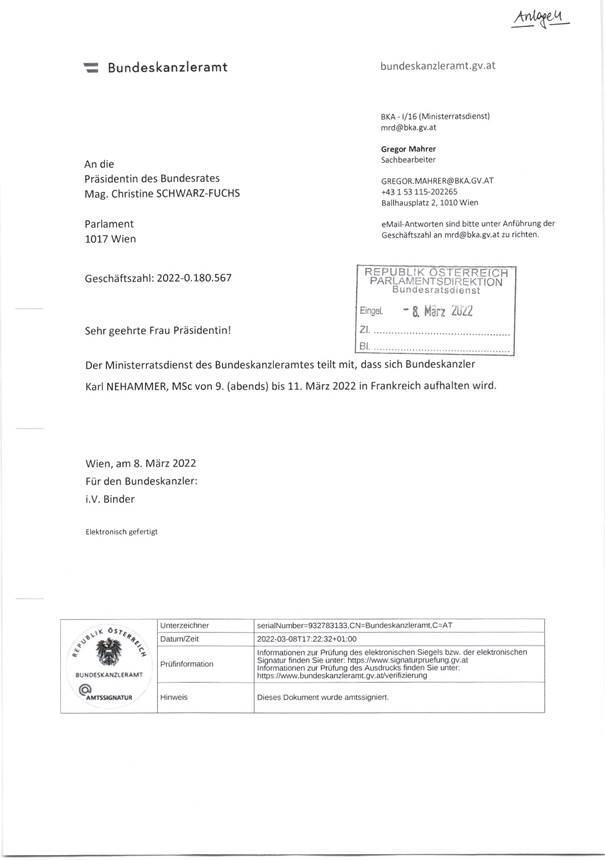 Schreiben des Ministerratsdienstes betreffend den Aufenthalt von Bundeskanzler Karl Nehammer, MSc von 9. März 2022 (abends) bis 11. März 2022 in Frankreich (Anlage 4)