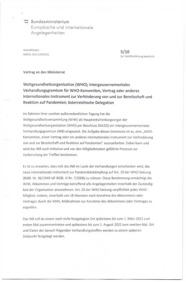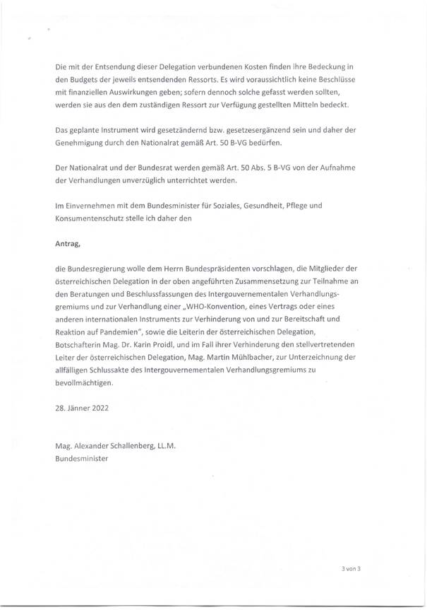 Schreiben des Generalsekretärs für auswärtige Angelegenheiten im Bundesministerium für europäische und internationale Angelegenheiten betreffend die Vollmacht zur Teilnahme Österreichs an den Beratungen und Beschlussfassungen des INB (Intergouver-nementales Verhandlungsgremium) und zur Verhandlung einer „WHO-Konvention, eines Vertrages oder eines anderen internationalen Instruments zur Verhinderung von und zur Bereitschaft und Reaktion auf Pandemien“ (Anlage 5)