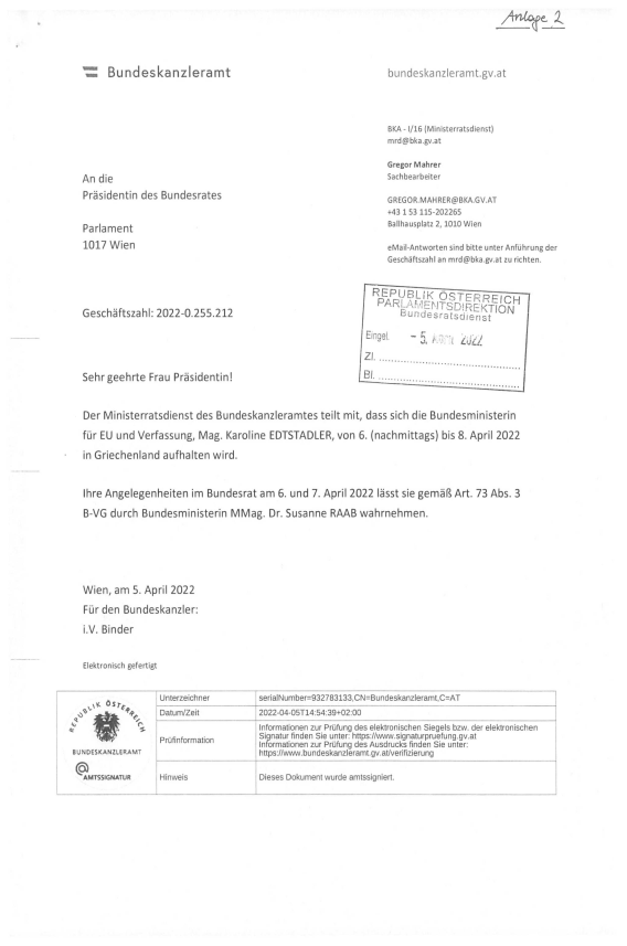 Schreiben des Ministerratsdienstes betreffend den Aufenthalt von Frau Bundesministerin für EU und Verfassung Mag. Karoline Edtstadler von 6. April 2022 (nachmittags) bis 8. April 2022 in Griechenland, wobei ihre Angelegenheiten im Bundesrat Frau Bundesministerin für Frauen, Familie, Integration und Medien MMag. Dr. Susanne Raab wahrnehmen wird (Anlage 2)