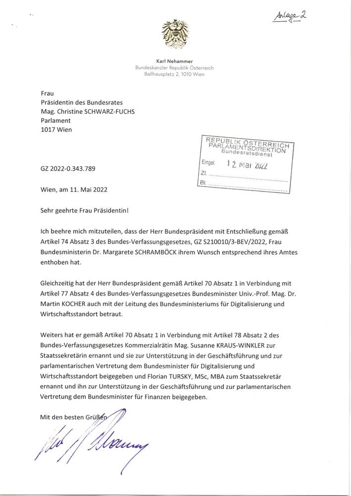 Schreiben des Bundeskanzlers Karl Nehammer, MSc betreffend Enthebung der Bundesministerin Dr. Margarete Schramböck vom Amt bei gleichzeitiger Betrauung des Bundesministers für Arbeit Mag. Dr. Martin Kocher mit der Leitung des Bundesministeriums für Digitalisierung und Wirtschaftsstandort und betreffend Ernennung von Mag. Susanne Kraus-Winkler zur Staatssekretärin zur Unterstützung in der Geschäftsführung und zur parlamentarischen Vertretung des Bundesministers für Digitalisierung und Wirtschaftsstandort und von Florian Tursky, MBA MSc zum Staatssekretär zur Unterstützung in der Geschäftsführung und zur parlamentarischen Vertretung des Bundesministers für Finanzen durch den Bundespräsidenten ............................................................................................ 94