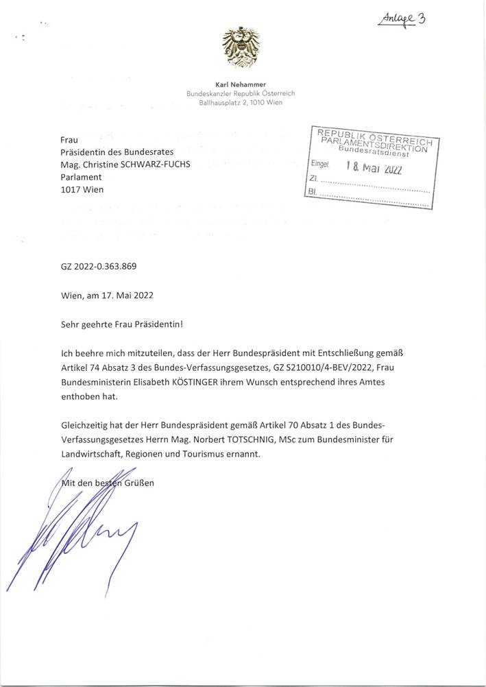 Schreiben des Bundeskanzlers Karl Nehammer, MSc betreffend Enthebung der Bundesministerin Elisabeth Köstinger vom Amt bei gleichzeitiger Ernennung von Mag. Norbert Totschnig zum Bundesminister für Landwirtschaft, Regionen und Tourismus durch den Bundespräsidenten ........................................................ 95