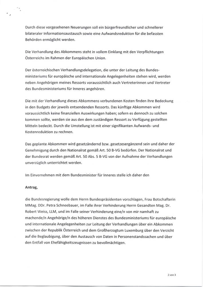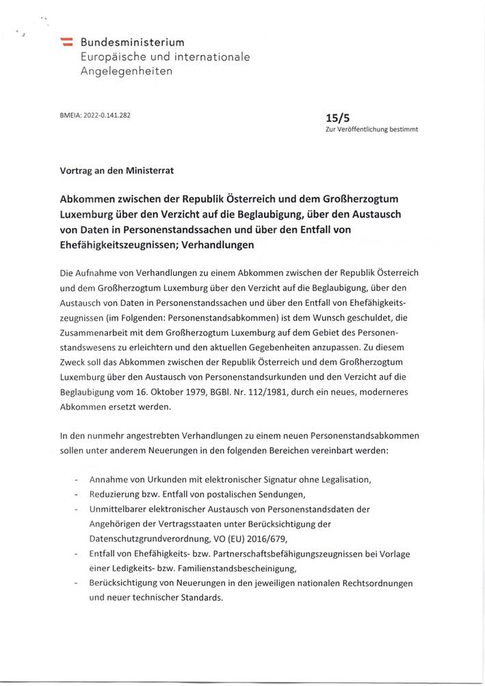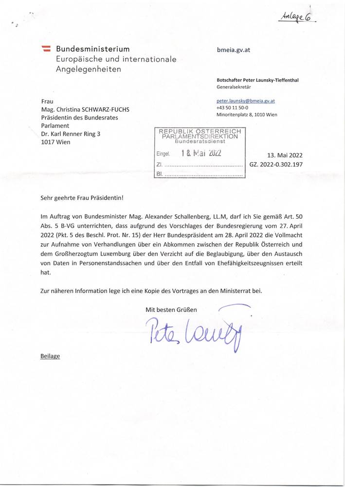Schreiben des Generalsekretärs im Bundesministerium für europäische und internationale Angelegenheiten gemäß Art. 50 Abs. 5 B-VG betreffend Erteilung der Vollmacht zur Aufnahme von Verhandlungen über ein Abkommen zwischen der Republik Österreich und dem Großherzogtum Luxemburg über den Verzicht auf die Beglaubigung, über den Austausch von Daten in Personenstandssachen und über den Entfall von Ehefähigkeitszeugnissen durch den Bundespräsidenten 98