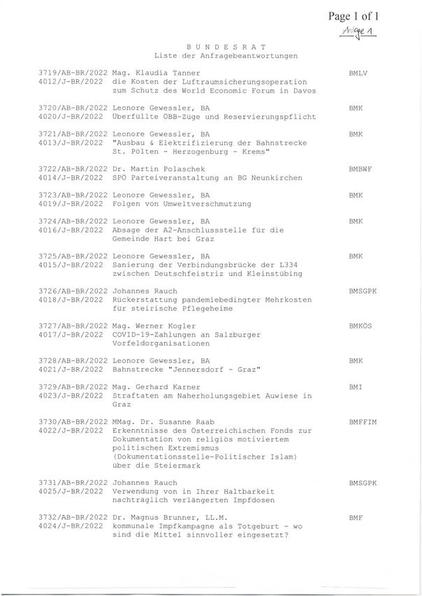 Schließlich eingelangt ist auch ein Schreiben des Ministerratsdienstes des Bundeskanzleramtes betreffend den Aufenthalt des Bundesministers für Inneres Mag. Gerhard Karner am 6. Oktober 2022 in Serbien, wobei er gemäß Art. 73 Abs. 1 Bundes-Verfassungsgesetz die Bundesministerin für Frauen, Familie, Integration und Medien MMag.a Dr. Susanne Raab bis 13 Uhr, Herrn Bundesminister für Finanzen Dr. Magnus Brunner, LL.M. von 13 bis 14 Uhr und hernach Herrn Bundesminister für Bildung, Wissenschaft und Forschung Dr. Martin Polaschek mit seiner Vertretung beauftragt hat.