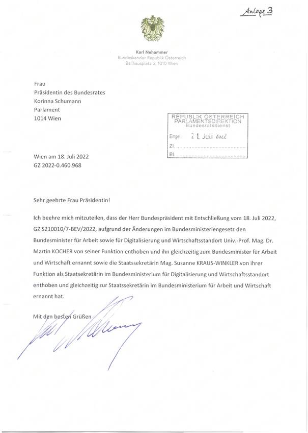 eines Schreibens des Herrn Bundeskanzlers betreffend Amtsenthebung des Herrn Bundesministers Mag. Dr. Martin Kocher von seiner Funktion als Bundesminister für Arbeit sowie für Digitalisierung und Wirtschaftsstandort bei gleichzeitiger Ernennung zum Bundesminister für Arbeit und Wirtschaft und von Frau Staatssekretärin Mag.a Susanne Kraus-Winkler von ihrer Funktion als Staatssekretärin im Bundesministerium für Digitalisierung und Wirtschaftsstandort bei gleichzeitiger Ernennung zur Staatssekretärin im Bundesministerium für Arbeit und Wirtschaft durch den Herrn Bundespräsidenten mit Entschließung vom 18. Juli 2022