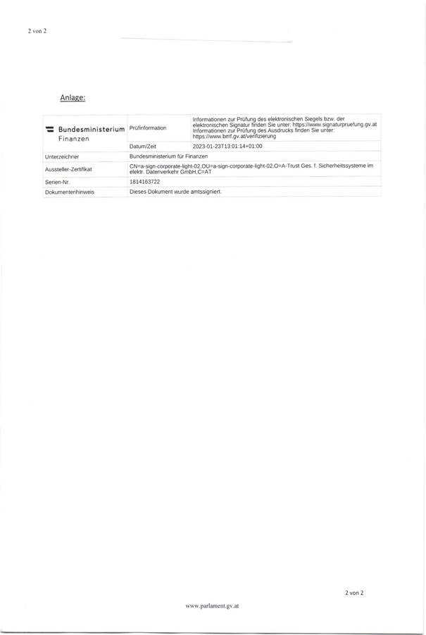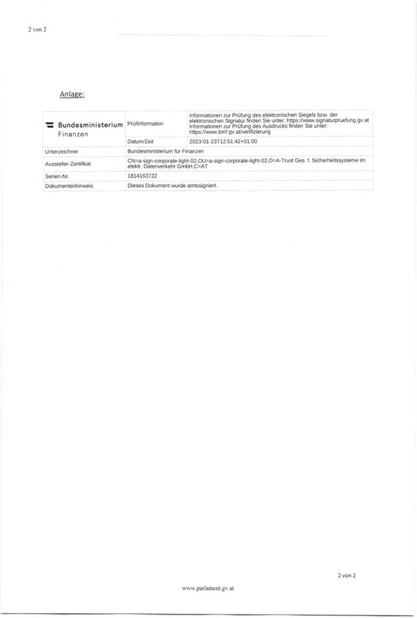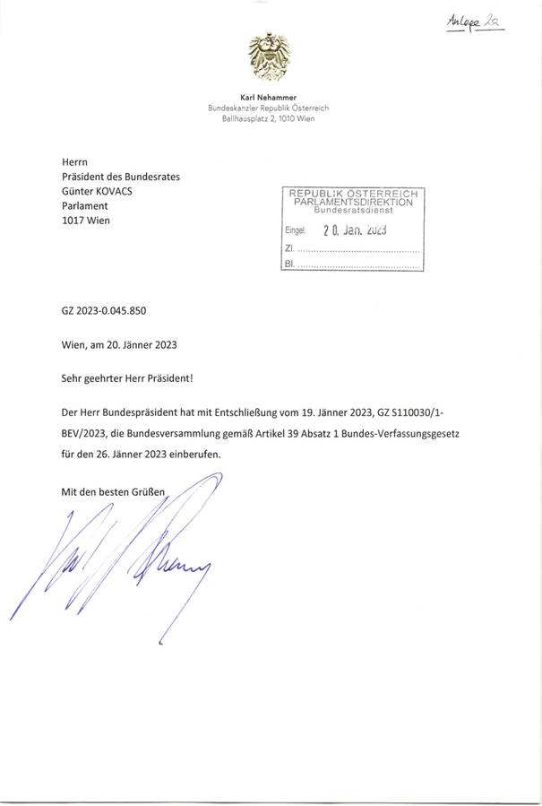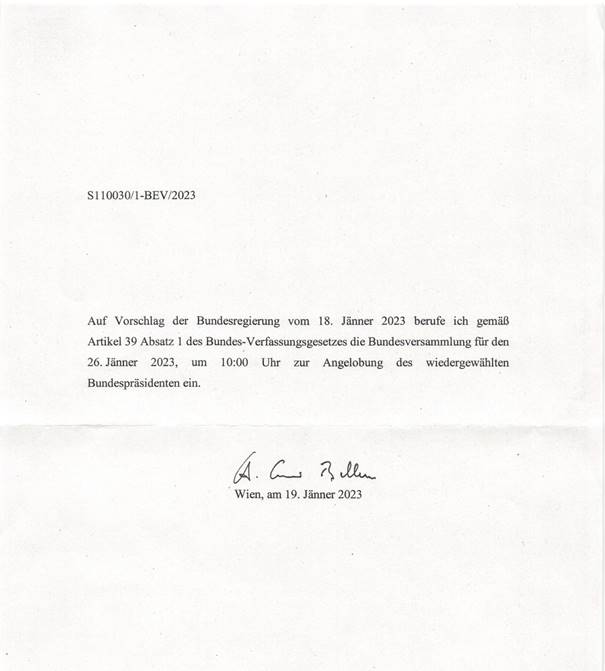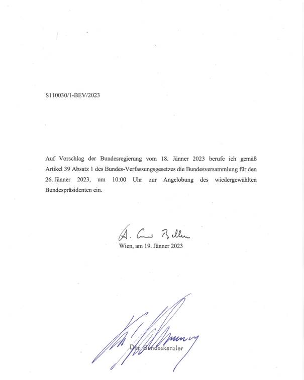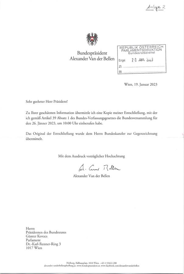 betreffend die Abschrift seiner Entschließung vom 19. Jänner 2023 auf Einberufung der Bundesversammlung gemäß Artikel 39 Absatz 1 Bundes-Verfassungsgesetz für den 26. Jänner 2023, um 10.00 Uhr zur Angelobung des wiedergewählten Bundespräsidenten (Anlage 2 und 2a)