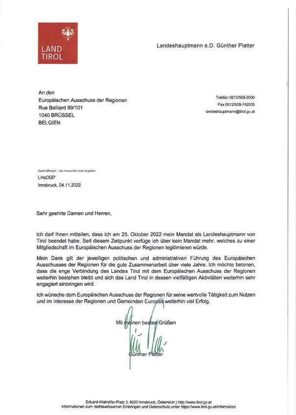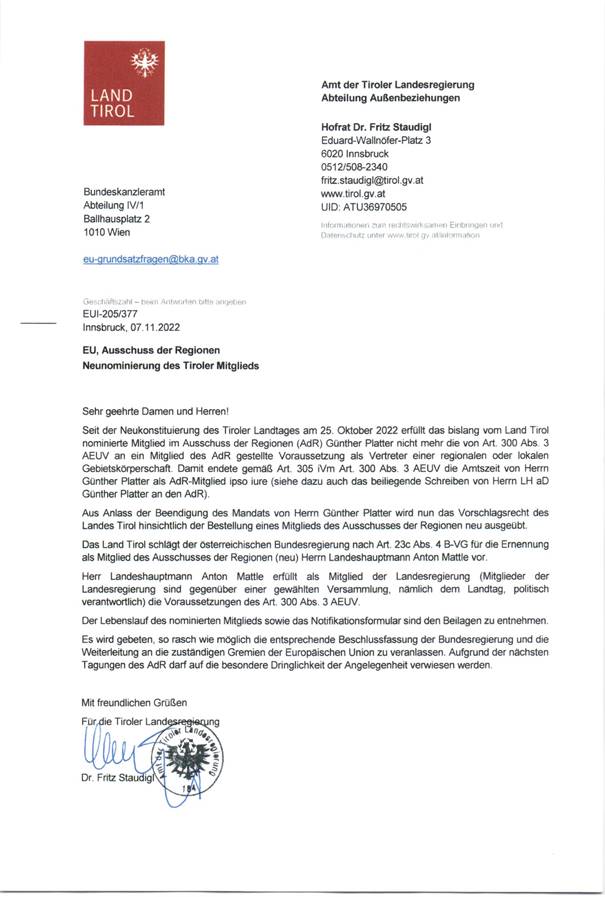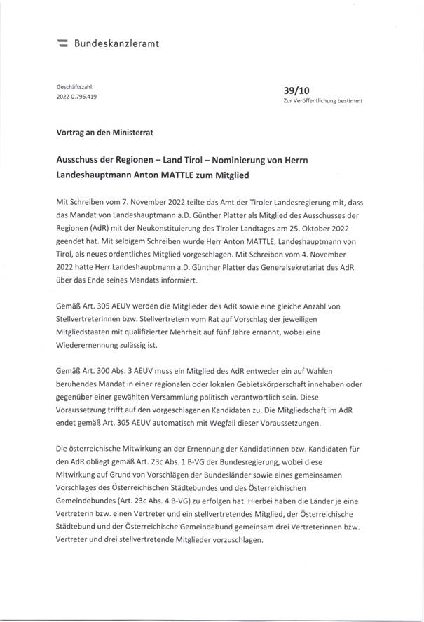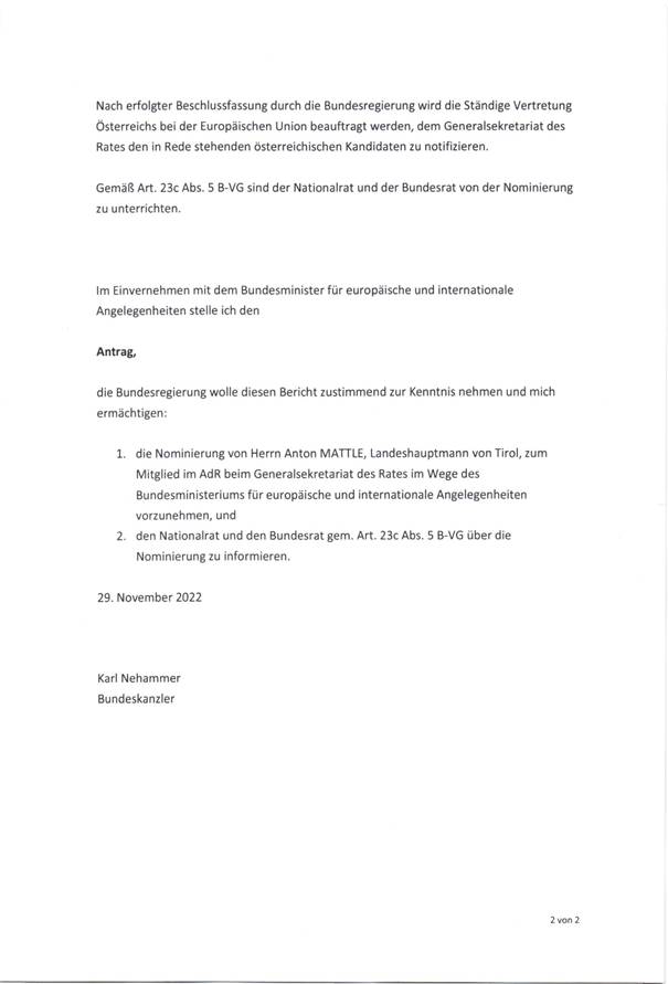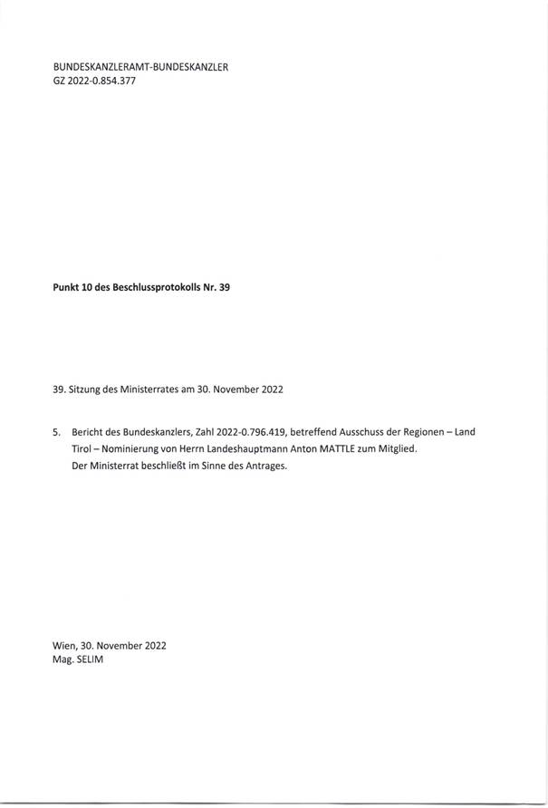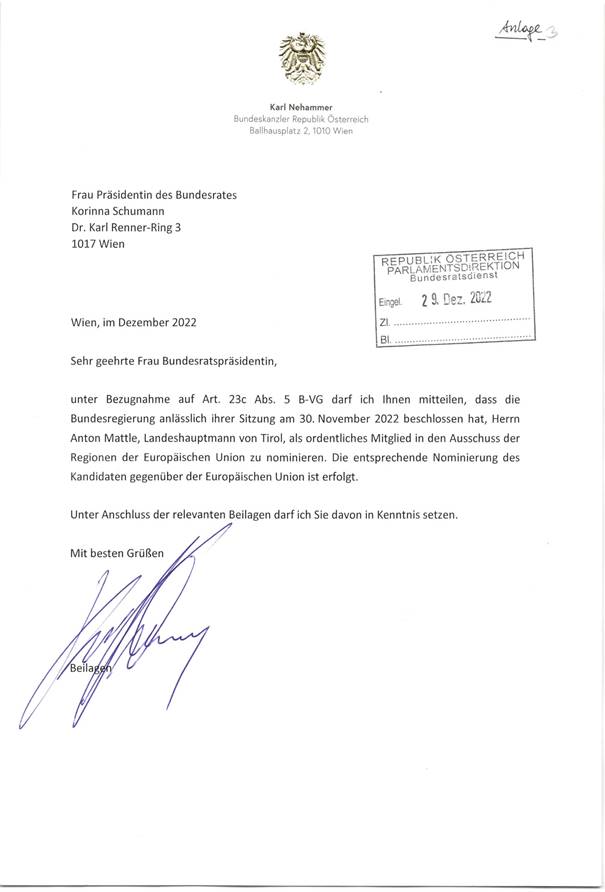 Nominierung von Herrn Anton Mattle zum ordentlichen Mitglied des Ausschusses der Regionen (Anlage 3)