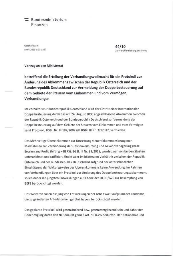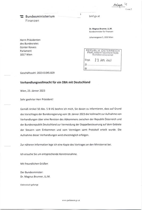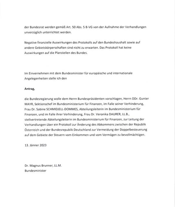Schreiben des Bundesministers für Finanzen betreffend Vollmacht zur Aufnahme von Verhandlungen über eine Revision des Abkommens zwischen der Republik Österreich und der Bundesrepublik Deutschland zur Vermeidung der Doppelbesteuerung auf dem Gebiete der Steuern vom Einkommen und vom Vermögen samt Protokoll (Anlage 4)