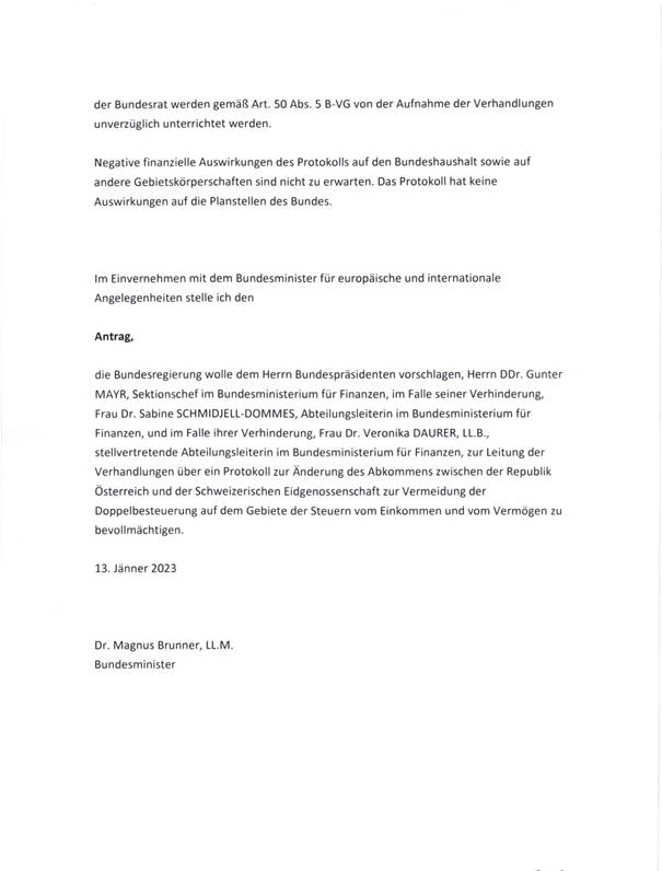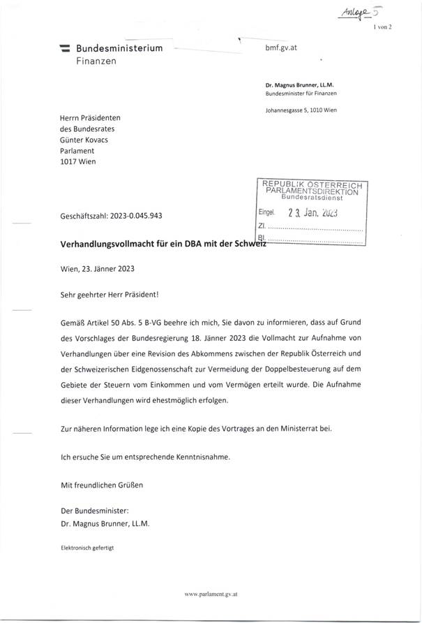 Schreiben des Bundesministers für Finanzen betreffend Vollmacht zur Aufnahme von Verhandlungen über eine Revision des Abkommens zwischen der Republik Österreich und der Schweizerischen Eidgenossenschaft zur Vermeidung der Doppelbesteuerung auf dem Gebiete der Steuern vom Einkommen und vom Vermögen (Anlage 5)