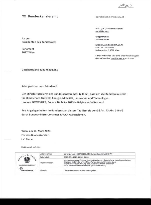 Schreiben des Ministerratsdienstes betreffend den Aufenthalt von Frau Bundesministerin für Klimaschutz, Umwelt, Energie, Mobilität, Innovation und Technologie Leonore Gewessler, BA am 16. März 2023 in Belgien, wobei ihre Angelegenheiten im Bundesrat Herr Bundesminister für Soziales, Gesundheit, Pflege und Konsumentenschutz Johannes Rauch wahrnehmen wird (Anlage 2)