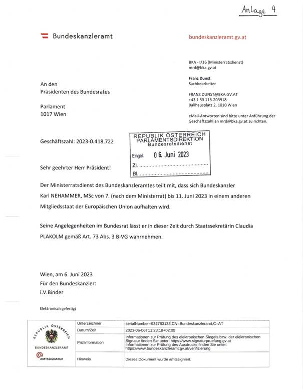 Schreiben des Ministerratsdienstes betreffend den Aufenthalt von Herrn Bundeskanzler Karl Nehammer, MSc von 7. (nach dem Ministerrat) bis 11. Juni 2023 in einem anderen Mitgliedstaat der Europäischen Union, wobei seine Angelegenheiten im Bundesrat Frau Staatssekretärin im Bundeskanzleramt Claudia Plakolm wahrnehmen wird (Anlage 4)