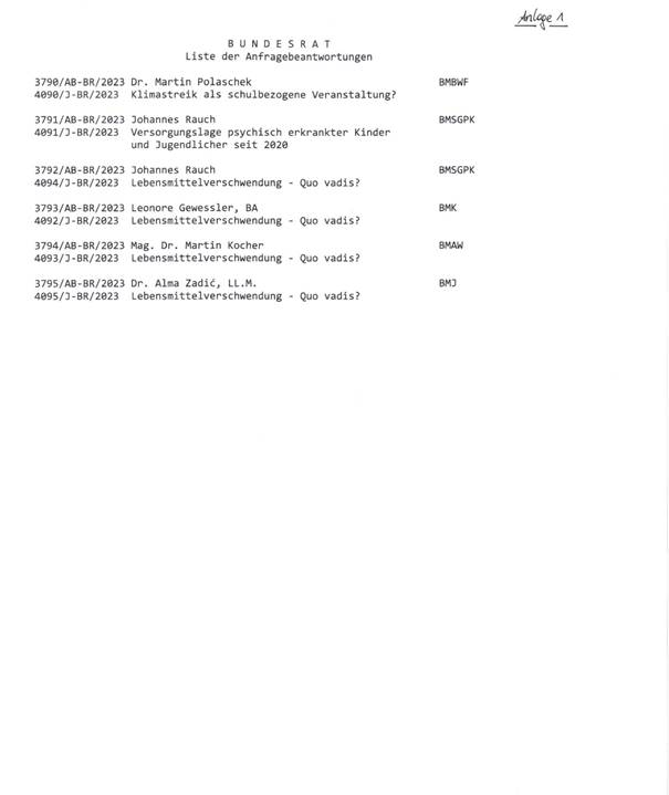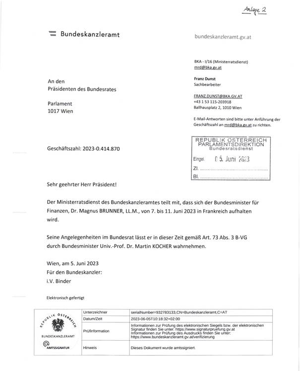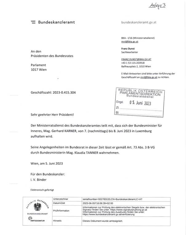 Die Einberufung der nächsten Sitzung des Bundesrates wird auf schriftlichem Wege erfolgen. Als Sitzungstermin ist Donnerstag, der 29. Juni 2023, 9 Uhr in Aussicht genommen.