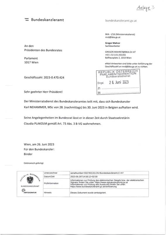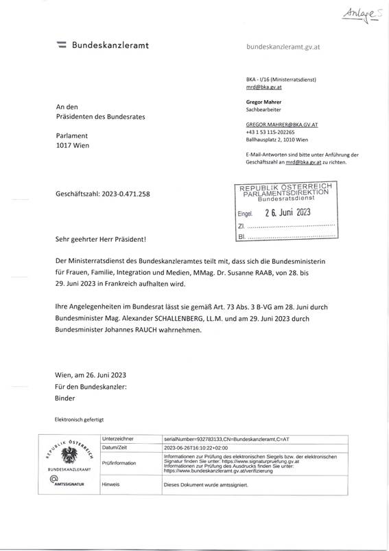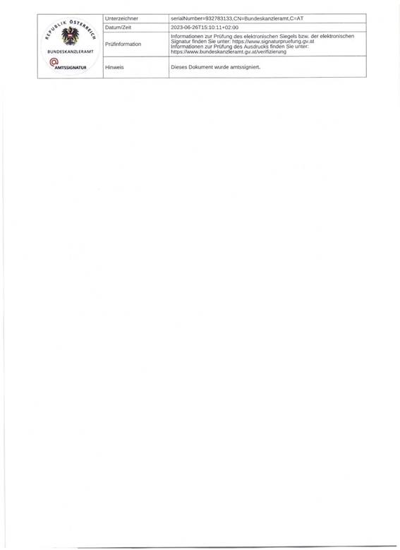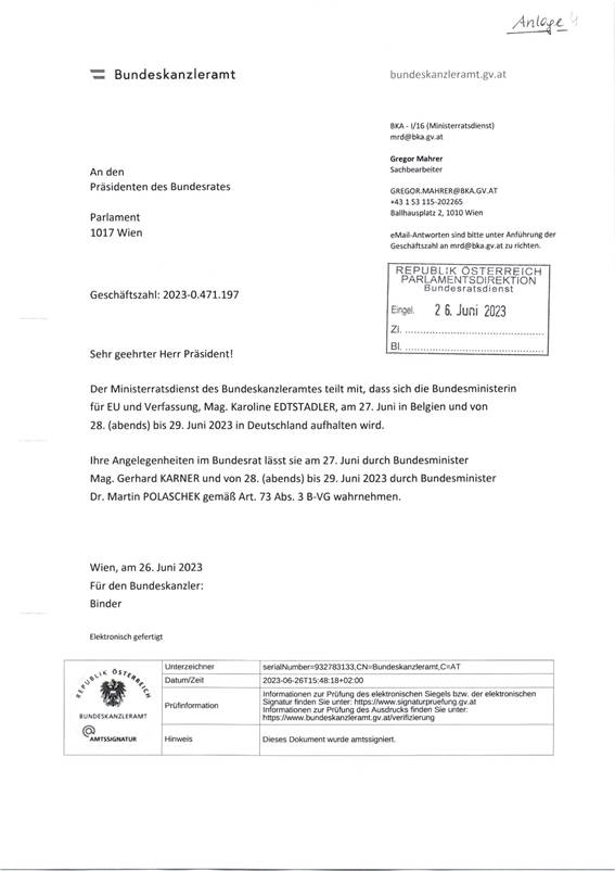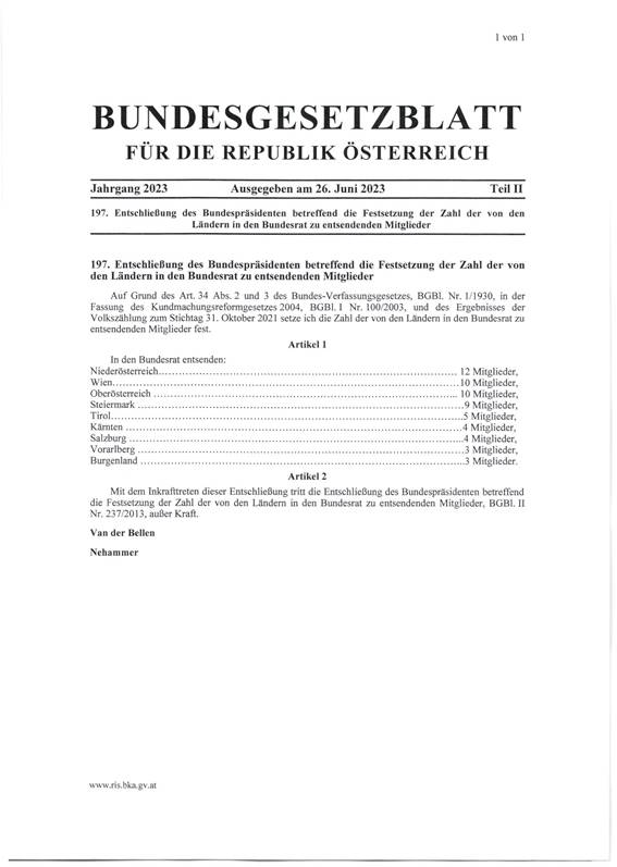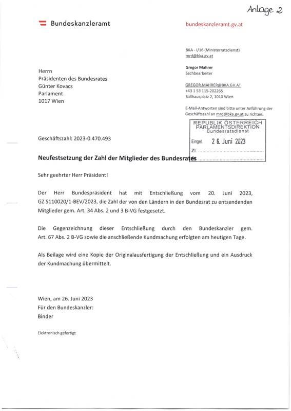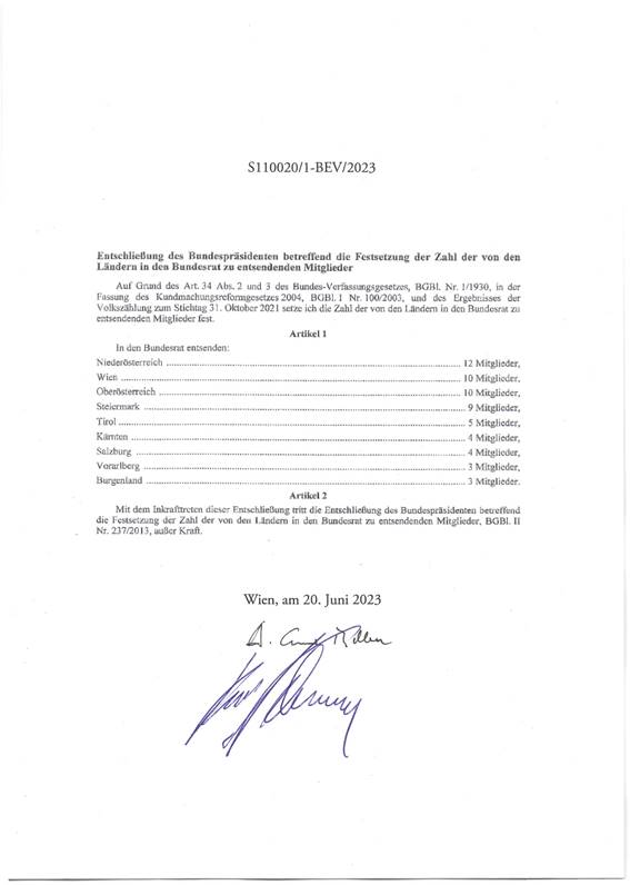 Schreiben des Bundeskanzleramtes betreffend die Neufestsetzung der Zahl der von den Ländern in den Bundesrat zu entsendenden Mitglieder gemäß Art. 34 Abs. 2 und 3 B-VG aufgrund der Entschließung des Bundespräsidenten vom 20. Juni 2023, deren Gegenzeichnung durch den Bundeskanzler sowie deren anschließende Kundmachung am 26. Juni 2023 erfolgt ist ........................................................................................................................................ 63